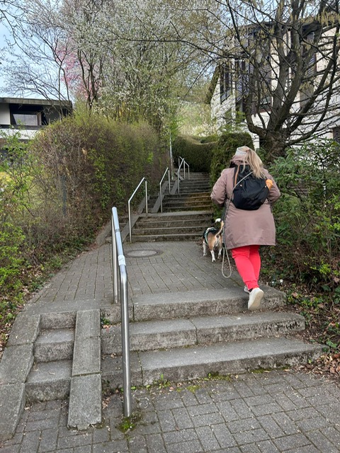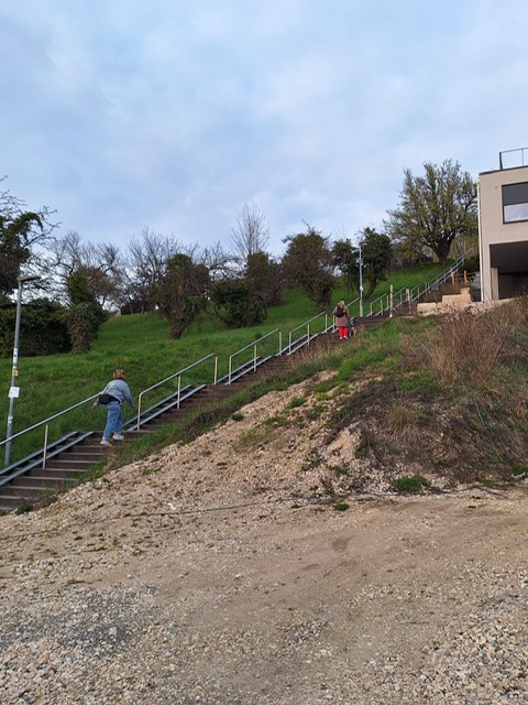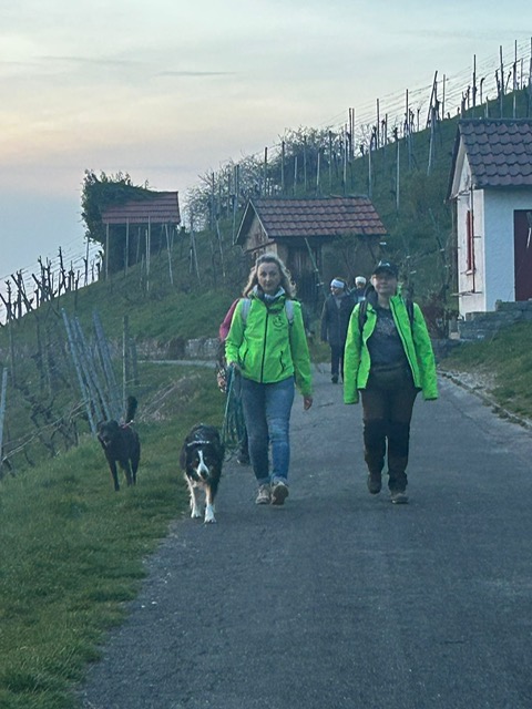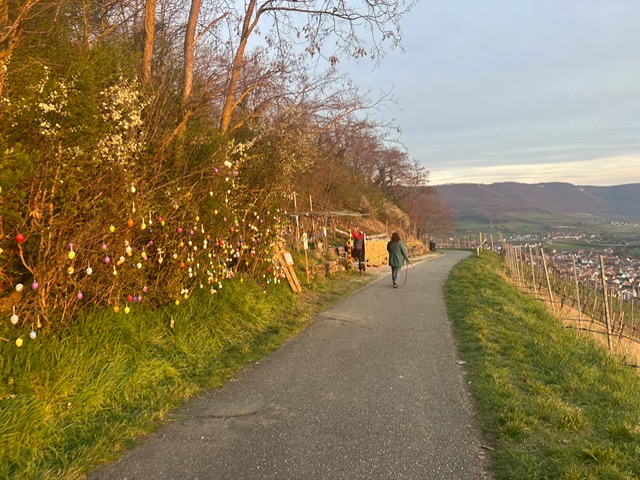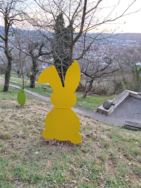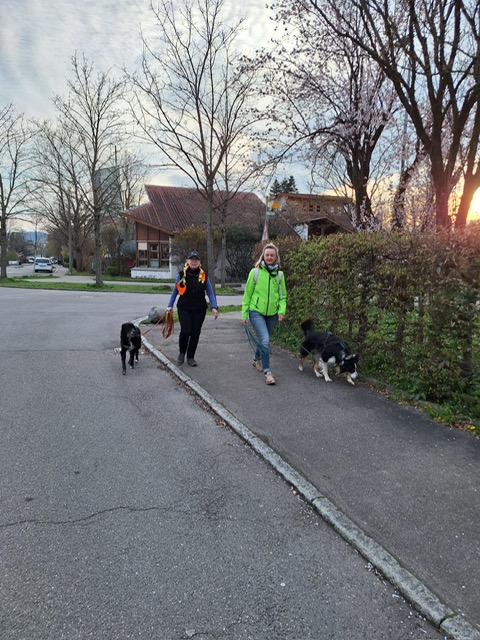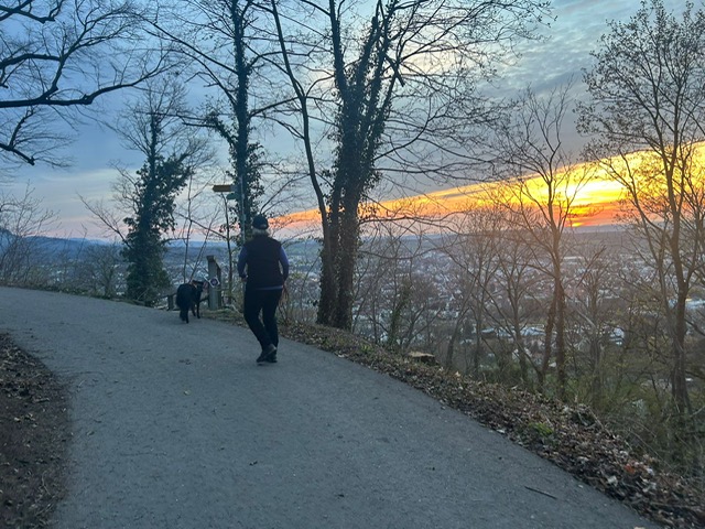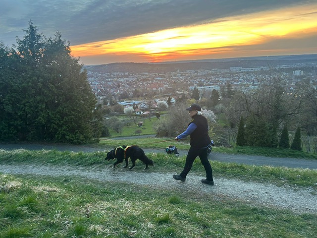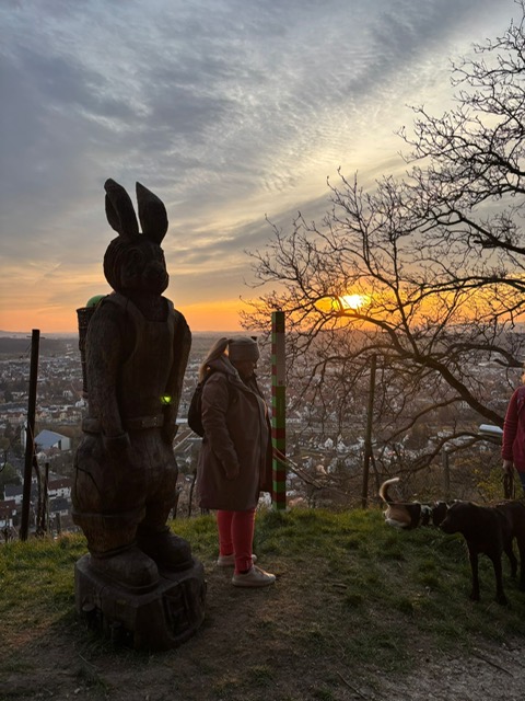 Ab diesem Zeitpunkt mussten sie einer 24 Stunden alten Spur folgen, die zufälligerweise auch durch den wunderschönen Metzinger Osterpfad führte. Um den Osterpfad zu erreichen, mussten jedoch zunächst einige Treppen und einen Anstieg von mehreren Metern überwunden werden – ein Herausforderung für Zwei- und Vierbeiner gleichermaßen. An den verschiedenen Etappenpunkten, an denen das Trailteam gewechselt wurde, gab es viel zu sehen und zu entdecken. Besonders beeindruckend war der Sonnenuntergang über Metzingen. Insgesamt legten wir fast 6 km zurück.