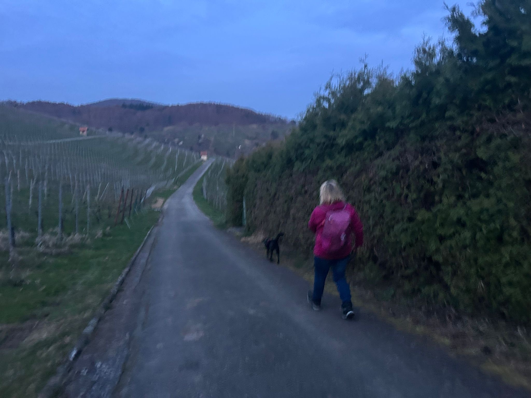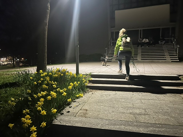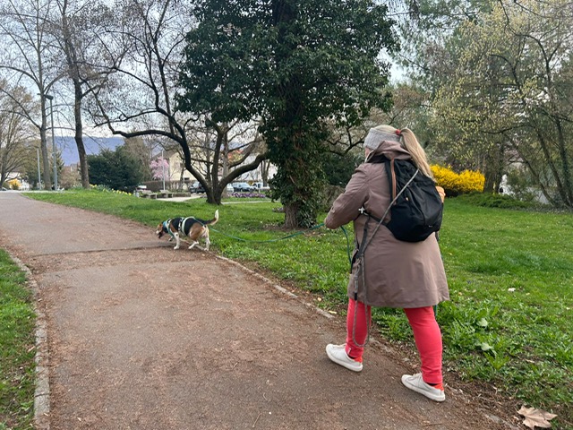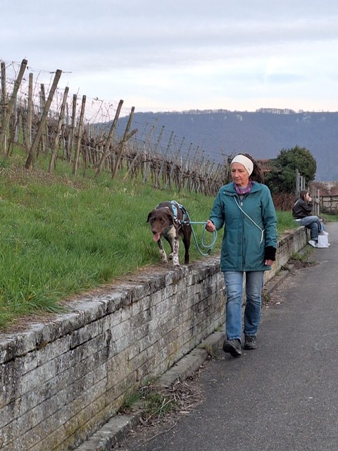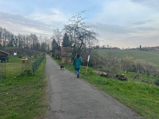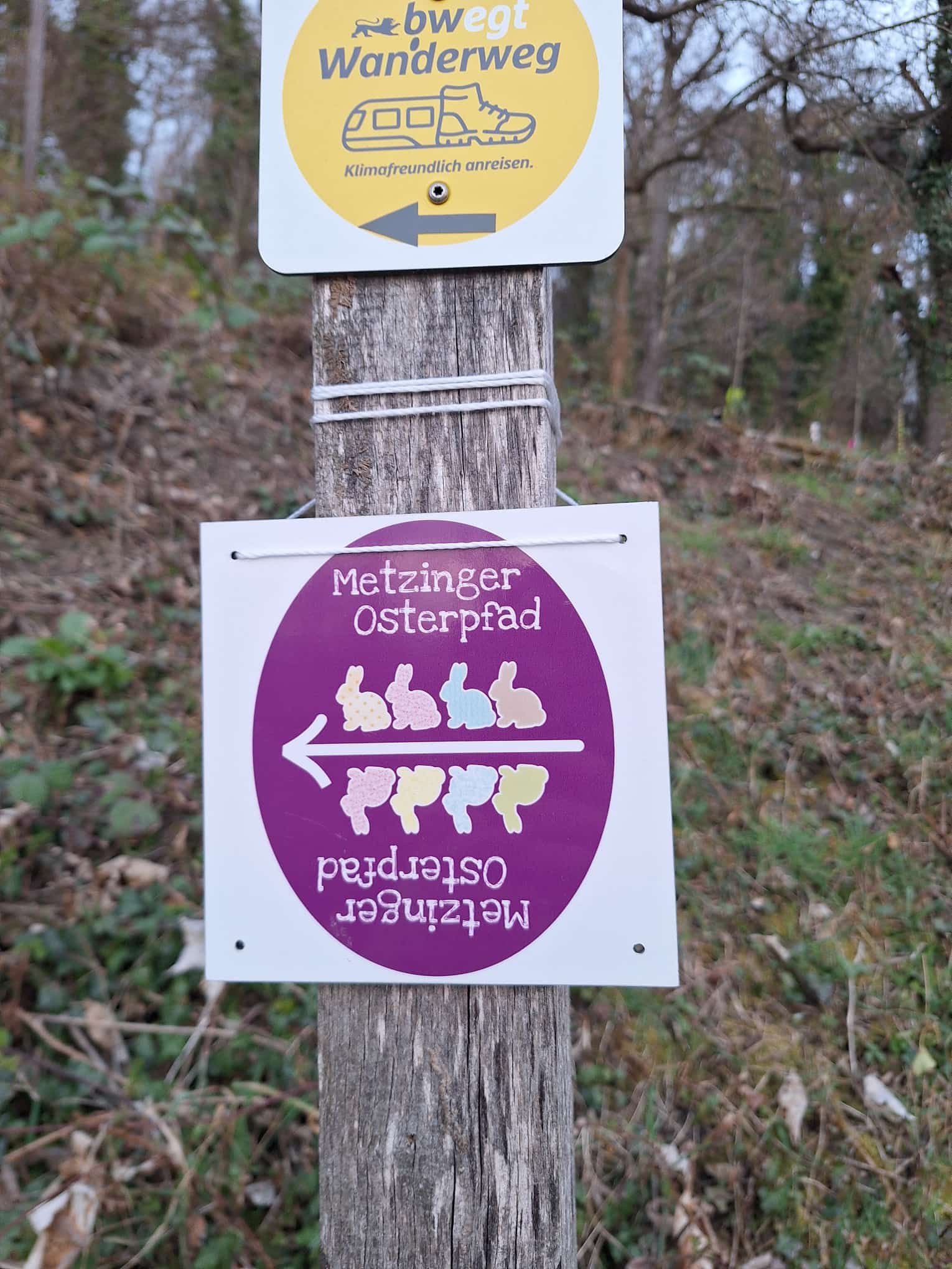 Ab diesem Zeitpunkt mussten sie einer 24 Stunden alten Spur folgen, die zufälligerweise auch durch den wunderschönen Metzinger Osterpfad führte. Um den Osterpfad zu erreichen, mussten jedoch zunächst einige Treppen und einen Anstieg von mehreren Metern überwunden werden – ein Herausforderung für Zwei- und Vierbeiner gleichermaßen. An den verschiedenen Etappenpunkten, an denen das Trailteam gewechselt wurde, gab es viel zu sehen und zu entdecken. Besonders beeindruckend war der Sonnenuntergang über Metzingen. Insgesamt legten wir fast 6 km zurück.
